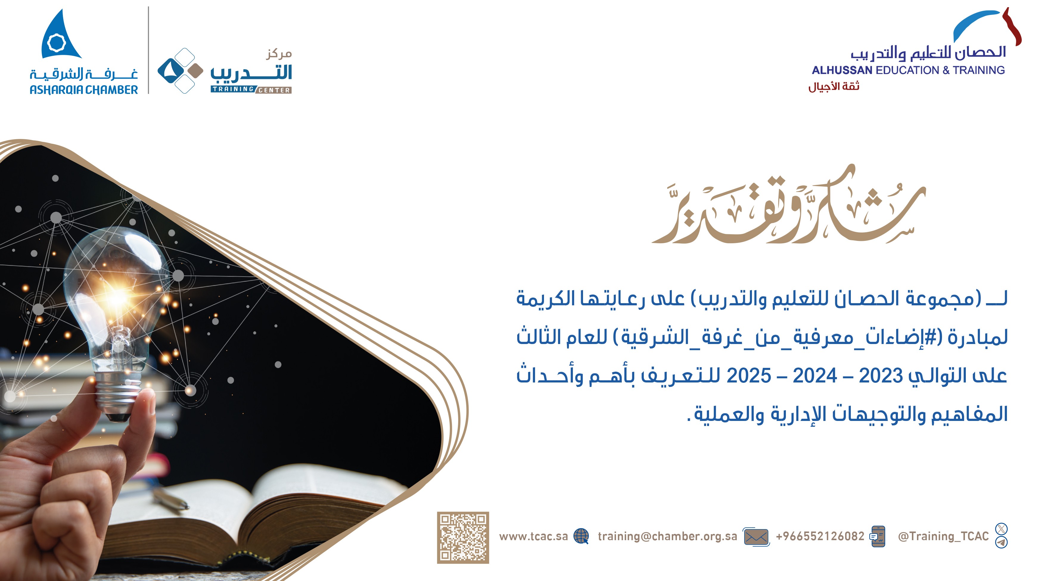 ضمن مبادرات مجموعة الحصان للتعليم والتدريب القابضة في دعم العنصر البشري السعودي، واستمرار تأهيل أبناء وبنات الوطن، وقعت المجموعة اتفاقية شراكة مع مركز غرفة الشرقية للتدريب للعام الثالث على التوالي، ضمن مبادرة (#اضاءات_معرفية_من_غرفة_الشرقية) للتعريف بأهم وأحدث المفاهيم والتوجيهات الإدارية والعملية.