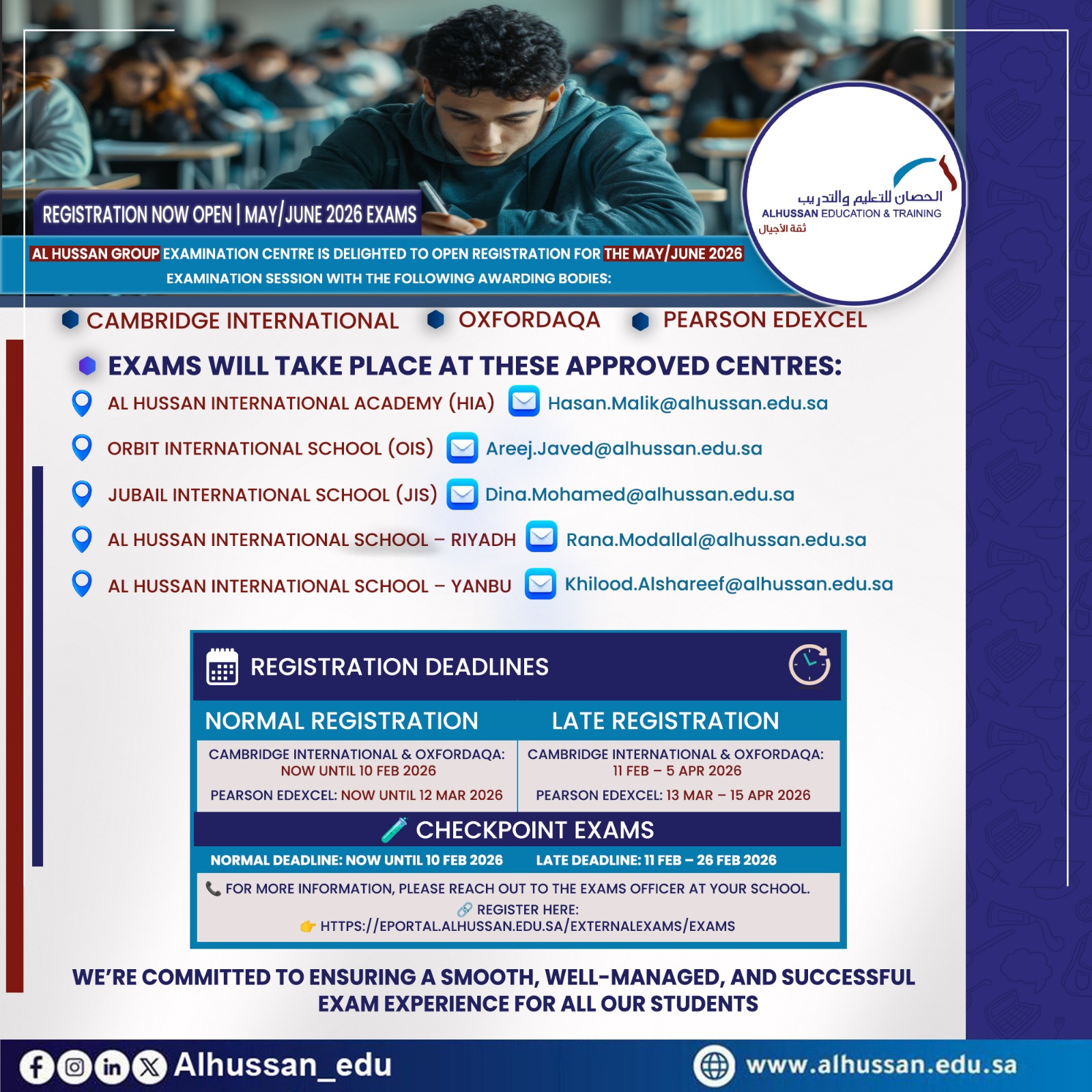 Al Hussan Group Examination Centre is delighted to open registration for the May/June 2026 examination session with the following awarding bodies: