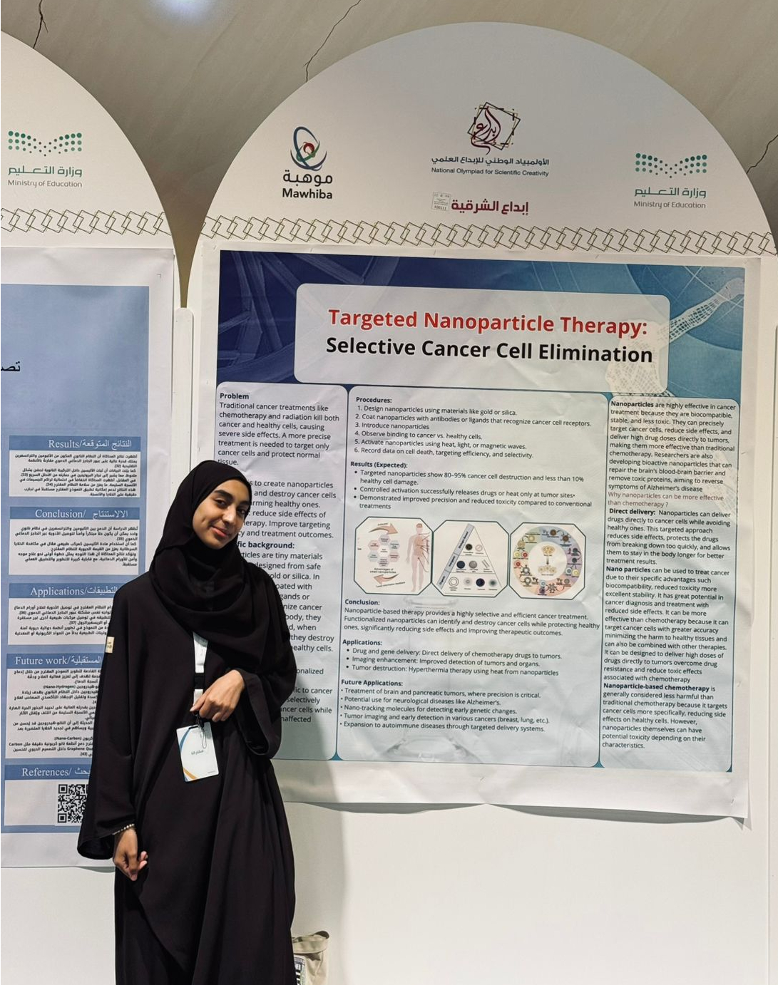 وجاء هذا التأهل عن مشروعها العلمي المتميز بعنوان "استخدام الجسيمات النانوية للتخلص من الخلايا السرطانية دون التأثير على الخلايا الصحية"، وذلك في مجال الطب الحيوي والعلوم الصحية، حيث يهدف المشروع إلى تقديم حلول مبتكرة وآمنة في علاج السرطان باستخدام التقنيات الحديثة.