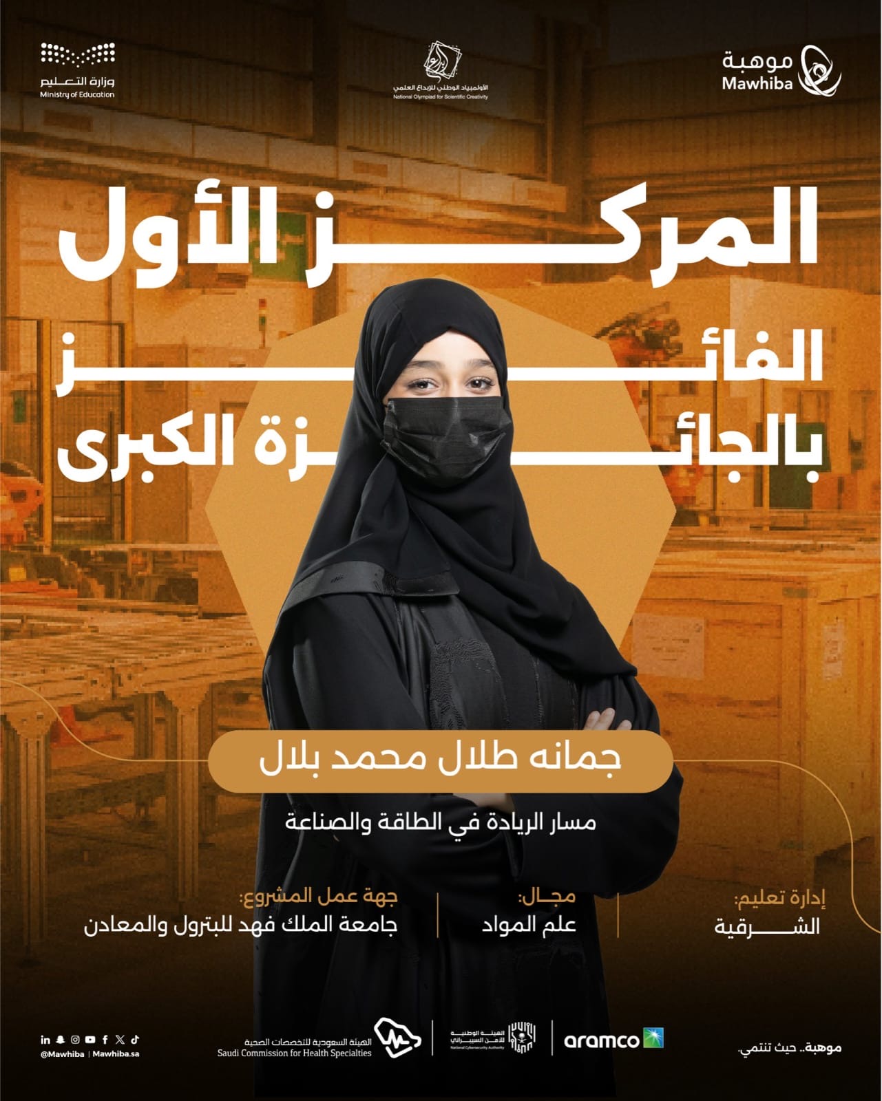 حققت الطالبة جُمانة طلال محمد بلال من مدرسة الحصان النموذجية للبنات بالجبيل المركز الأول في أولمبياد الإبداع 2026م ضمن مسار الريادة والطاقة والصناعة في مجال علم المواد.