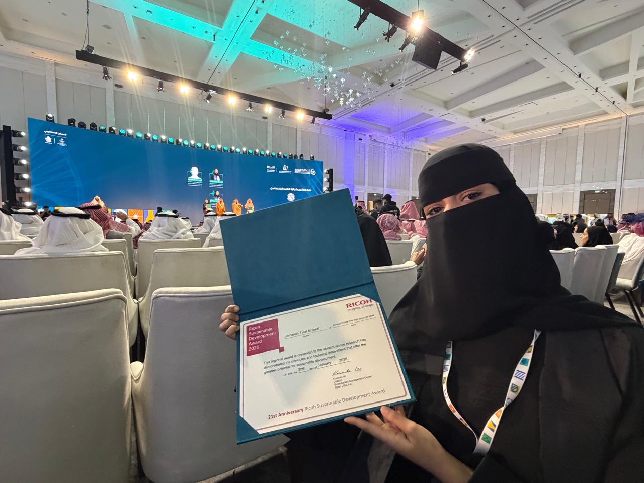 كما حصلت على جائزة خاصة من مؤسسة ريكو الأمريكية، وتأهلت لتمثيل المملكة في تصفيات آيسف 2026م، في إنجاز يعكس تميزها العلمي وقدرتها الابتكارية.