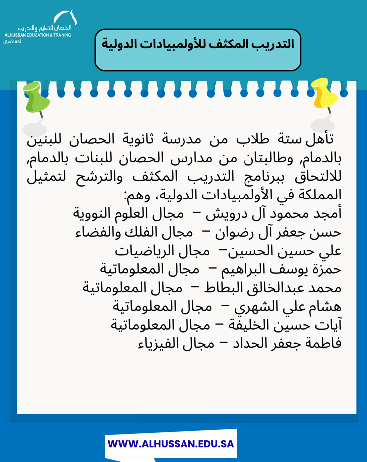 تأهل ستة طلاب من مدرسة ثانوية الحصان للبنين بالدمام, وطالبتان من مدارس الحصان للبنات بالدمام, للالتحاق ببرنامج التدريب المكثف والترشح لتمثيل المملكة في الأولمبيادات الدولية، وهم: